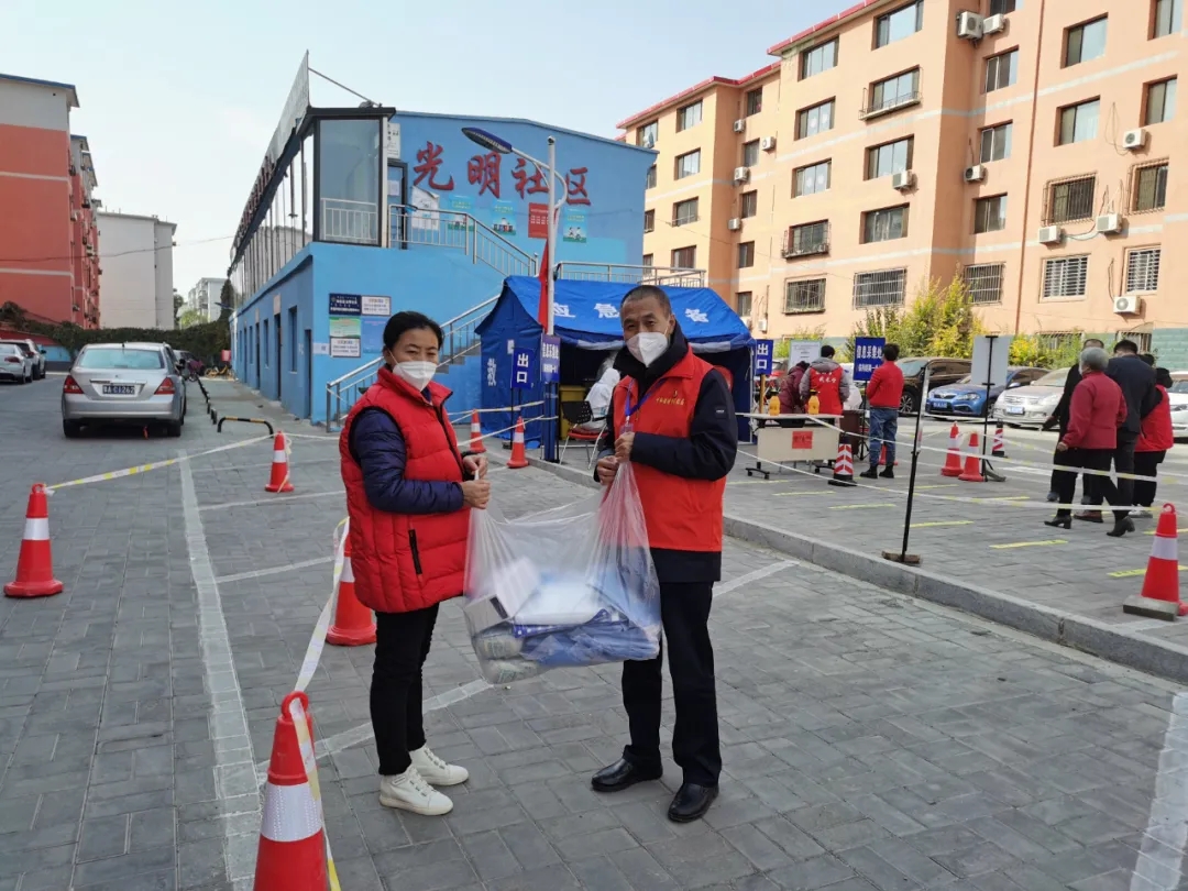 初心如磐当奋楫笃行,使命在肩更披肝沥胆。在了解到社区缺乏的物资后,支部书记常连海向光明社区周书记捐赠防护服、N95口罩、一次性手套等防护物资!