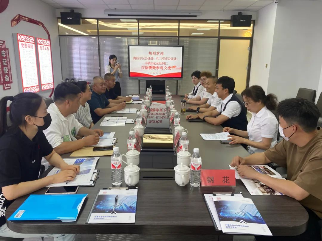 为进一步提高公证质量、推动公证业务规范发展、提升公证业务水平,近日,海拉尔区公证处、扎兰屯市公证处、丰镇市公证处同仁到正信公证处参观交流,共同开展公证业务座谈,加强沟通联动,深化业务交流,凝聚共识,通过分享好经验好做法,促进各处公证服务能力有效提升。