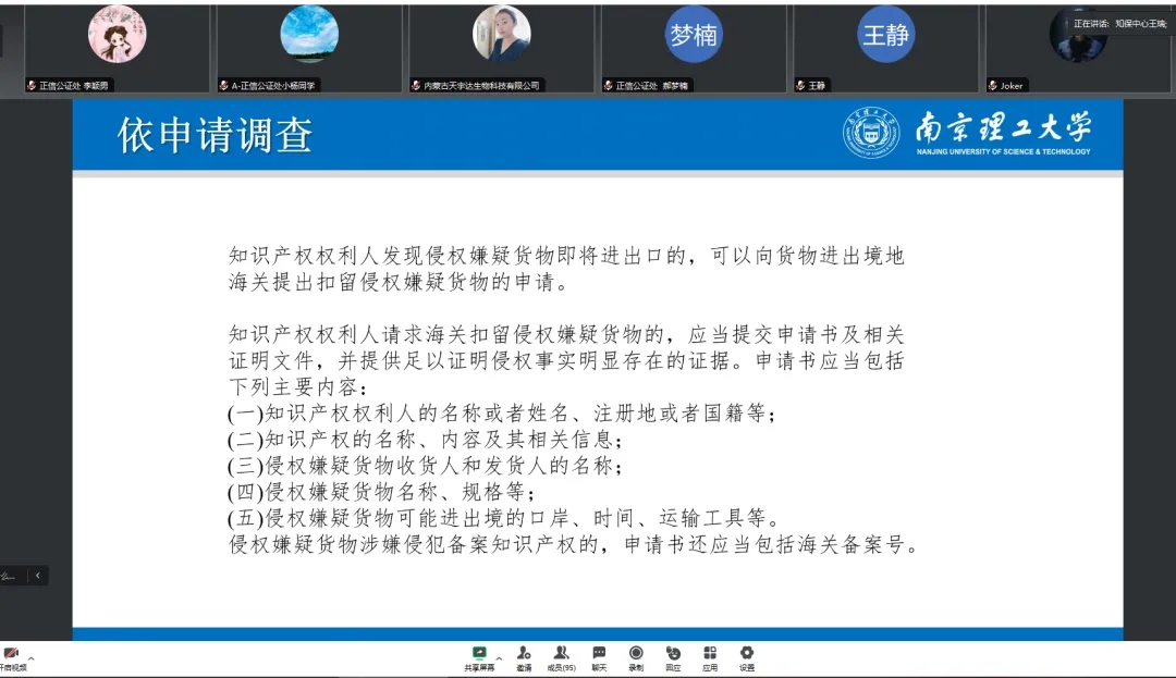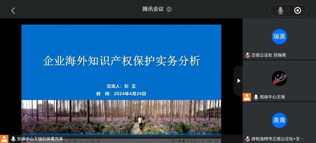 为了不断提高知识产权公证的专业标准,近日,正信公证处组织全体公证人员参加了由内蒙古自治区知识产权保护中心举办的海外知识产权风险防范培训。该培训的核心目标是增强公证人员对国际知识产权法律的理解,掌握全球知识产权的最新动态,以及加深对知识产权的申请、保护、管理及运营的综合知识。