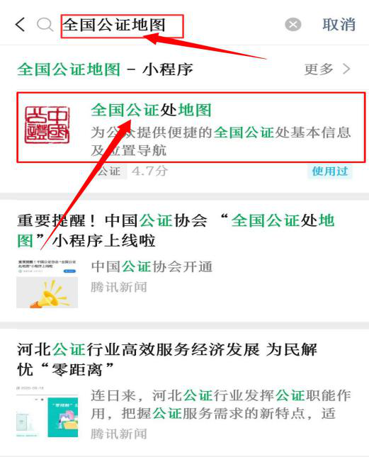 1、打开微信,在微信小程序搜栏中输入“全国公证地图”,点击“全国公证处地图”图标。