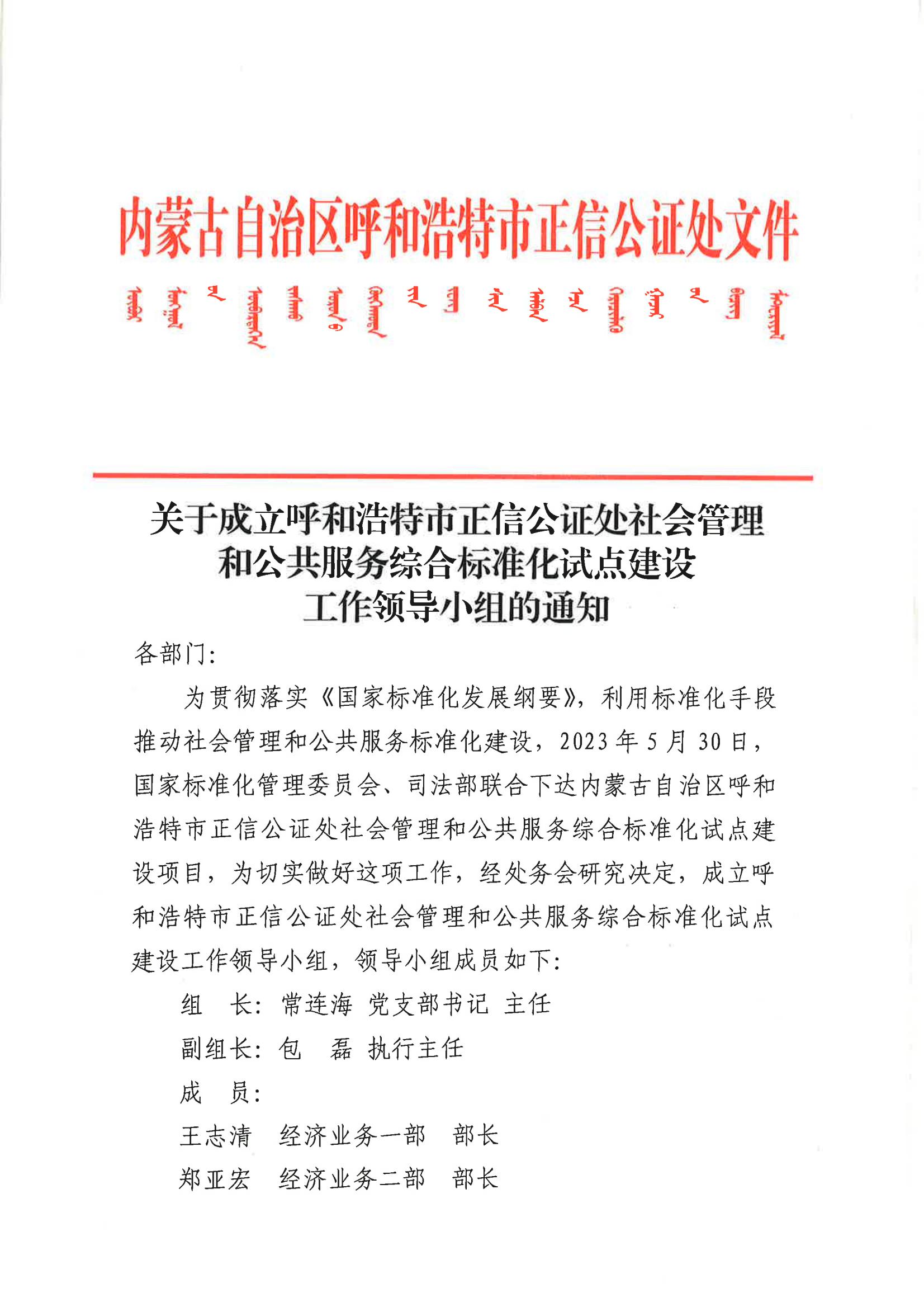 关于成立呼和浩特市正信公证处社会管理和公共服务综合标准化试点建设 工作领导小组的通知